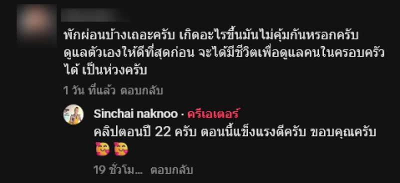 คอมเมนต์ชาวเน็ต อาทิ พักผ่อนบ้างเถอะครับ เกิดอะไรขึ้นมันไม่คุ้มกันหรอกครับ ดูแลตัวเองให้ดีที่สุดก่อน จะได้มีชีวิตเพื่อดูแลคนในครอบครัวได้ เป็นห่วงครับ,น่าจะถ่ายละครเยอะไม่มีเวลาพักผ่อนค่ะ,เคยเป็นเหมือนกันคะยืนซื้อลูกชิ้นอยู่ดีๆหายใจไม่ค่อยออกประมา2นาทีหน้ามืดวูบล้มไปเลยคะทุกวันนี้กลัวกลับมาเป็นแบบนี้อีกคะ เป็นต้น