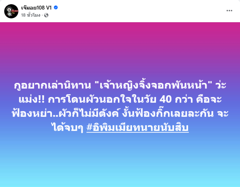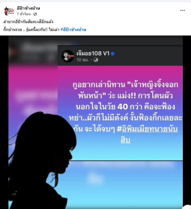 จากประเด็นที่ก่อนหน้านี้ทางด้านเพจ เจ๊มอย108 V1 ได้ออกมาโพสต์เปิดประเด็นว่า xูอยากเล่านิทาน เจ้าหญิงจิ้งจอกพันหน้า ว่ะ แม่ง!! การโดนผัวนอกใจในวัย 40 กว่า คือจะฟ้องหย่า..ผัวก็ไม่มีตังค์ งั้นฟ้องกิ๊กเลยละกัน จะได้จบๆ #อิพิมเมียทนายนับสิบ