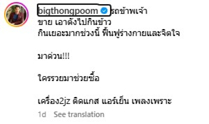 ล่าสุด ด้านหนุ่มบิ๊ก ได้ออกมาเคลื่อนไหวผ่านโลกโซเชียลอีกครั้ง พร้อมโพสต์ประกาศขายรถสุดหรู อย่าง BMW e34 ด้วยราคาทำหลายคนช็อก เพียง55,000 บาทเท่านั้น ซึ่งงานนี้ก็ทำเอาแฟนๆต่างพากัน อึ้ง ทึ่ง ไปตามๆกันเลยทีเดียวว่า ทำไมด้านหนุ่มบิ๊ก ถึงกล้าปล่อยขายรถรักสุดหวงในราคานี้ ก่อนที่ในเวลาต่อมา ด้านเจ้าตัวจะออกมาเฉลยอย่างอารมณ์ดีว่า ขายเอาตังค์ไปกันข้าว กินเยอะมากช่วงนี้ ฟื้นฟูร่างกายและจิตใจ พร้อมพูุดติดฮา ปิดท้ายว่า เครื่อง 2jz ติดแก๊ส แอร์เย็น เพลงเพราะ งานนี้ทำเหล่าแฟนๆต่างพากันคอมเมนต์แซวรัวๆกันเลยทีเดียวว่า ใครจะได้รถหรูคันนี้ไปครอบครองกันนะ