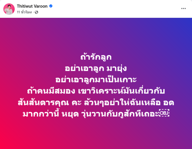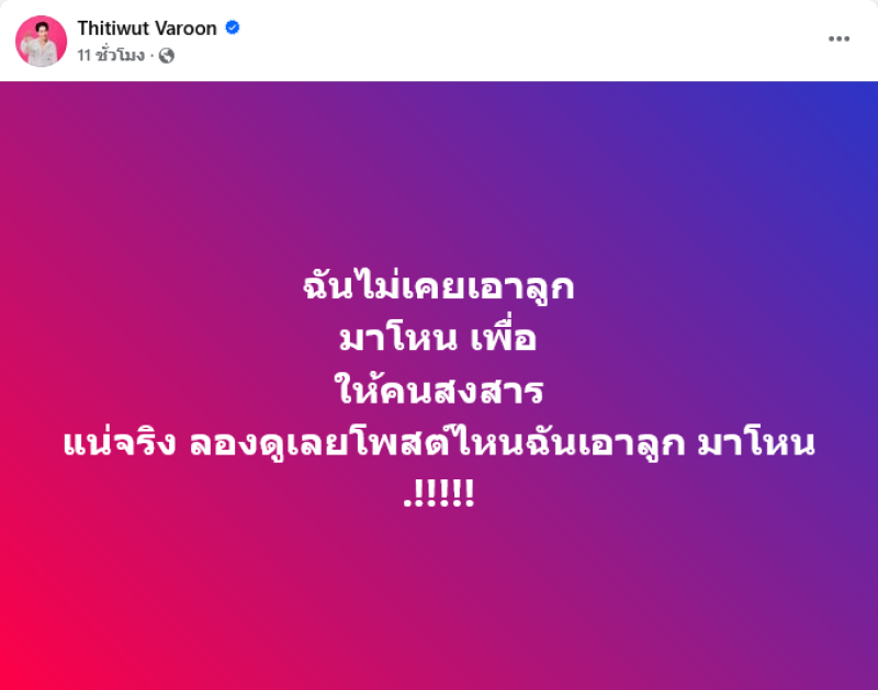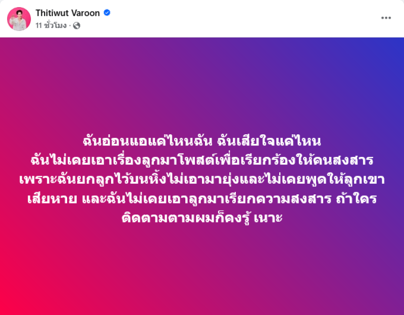 ฉันอ่อนแอแค่ไหนฉัน ฉันเสียใจแค่ไหน ฉันไม่เคยเอาเรื่องลูกมาโพสต์เพื่อเรียกร้องให้คนสงสาร เพราะฉันยกลูกไว้บนหิ้งไม่เอามายุ่งและไม่เคยพูดให้ลูกเขาเสียหาย และฉันไม่เคยเอาลูกมาเรียกความสงสาร ถ้าใครติดตามตามผมก็คงรู้ เนาะ