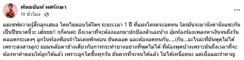 ยังคงเป็นประเด็นที่ทั้งคู่ยังโต้กลับกันไปมาสำหรับ แพรวพราว แสงทอง และอดีตสามี บิ๊ก ผู้ใหญ่บ้านฟินแลนด์ ที่ก่อนหน้านี้ บิ๊ก ได้ออกมาโพสต์ข้อความฟาดเดือดรัวๆ ล่าสุดทางด้าน แพรวพราว ได้ออกมาโพสต์ข้อความผ่านทางเฟซบุ๊ค พัทธนันท์ ทศรักษา ระบุว่า แม่เซฟความรู้สึกลูกเสมอ โดยไม่ตอบโต้ใดๆ ระยะเวลา 1 ปี ที่แม่งโครตจะอดทน