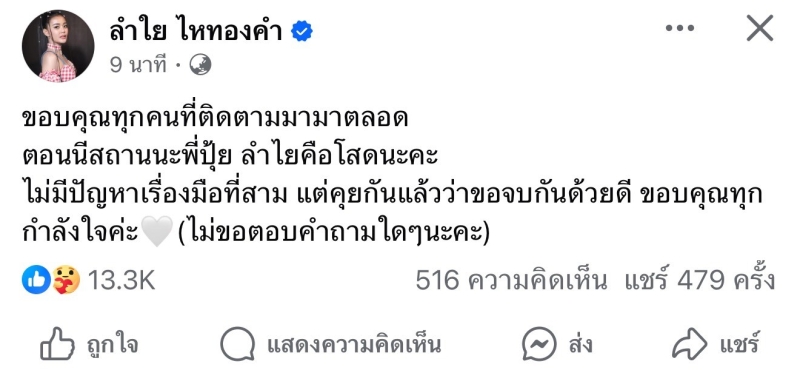 เรียกได้ว่า ทำเอาแฟนๆต่างพากันช็อกไปตามๆกันเลยทีเดียว เมื่อด้านคู่รักของนักร้องสาวลูกทุ่งหมอลำ อย่าง ลำไย ไหทองคำ กับแฟนหนุุ่ม อย่าง ปุ้ย L.กฮ ที่ล่าสุดได้ออกมาประกาศเลิกรากันไป หลังจากที่ได้มีการคบหากันมานานกว่า 9 ปี