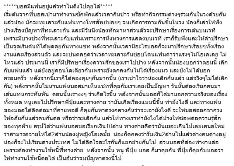 เราก็รับฟังและให้คำปรึกษา เป็นจุดเริ่มต้นที่ได้พูดคุยกันทางแชท หลังจากนั้นเวลามีอะไรบอสก็จะมาปรึกษาเรื่อยๆทั้งเรื่องงานและเรื่องส่วนตัว และจะบ่นตลอดว่าเวลาทะเลาะกันชอบโดนแฟนด่าว่าแรงๆไม่โอเคเลย ไม่ไหวแล้ว ประมานนี้ ” “เราก็มีปรึกษาเรื่องความรักของเราไปบ้าง หลังจากนั้นน้องบอกว่าตอนนี้ เลิกกับแฟนแล้ว แต่ยังอยู่คอนโดเดียวกันเพราะยังตกลงกันไม่ได้เรื่องแมว และยังไม่ได้บอกครอบครัว หลังจากนี้เราก็ได้ลองคุยๆกันมากขึ้น (เราเข้าใจว่าน้องเลิกกันแล้ว แต่จริงๆไม่ได้เลิกกัน) หลังจากนั้นไม่นานแฟนบอสมาเห็นแชทที่คุยกับเราเลยเป็นปัญหา