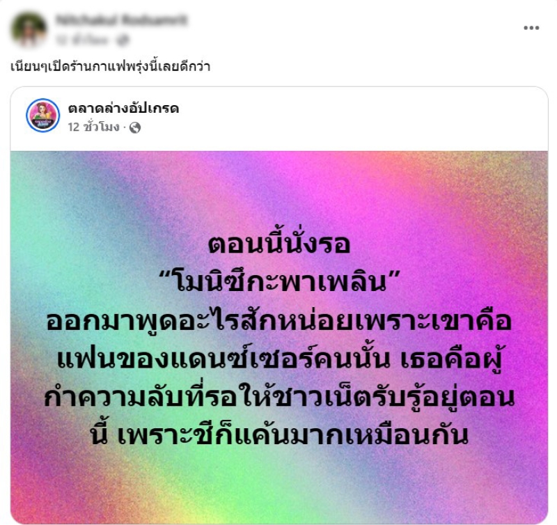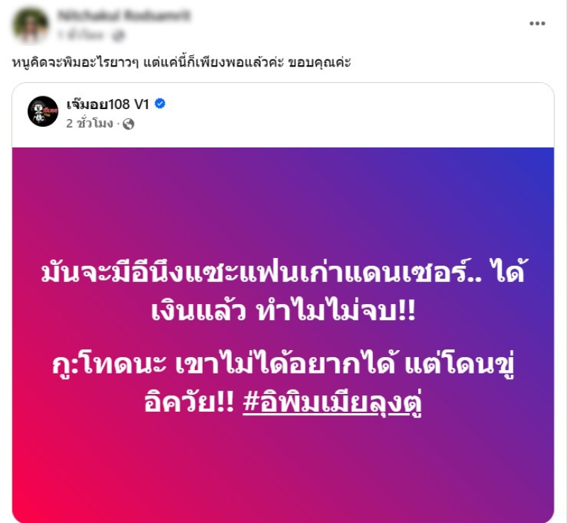 ล่าสุด อดีตแฟนสาวของ บอส แดนเซอร์ชาย แชร์โพสต์ เจ๊มอย 108 ที่ระบุข้อความว่า “มันจะมีอีนึงแซะแฟนเก่าแดนเซอร์.. ได้เงินแล้ว ทำไมไม่จบ!! กู:โทดนะ เขาไม่ได้อยากได้ แต่โดนขู่ อิควัย!! #อิพิมเมียลุงตู่”