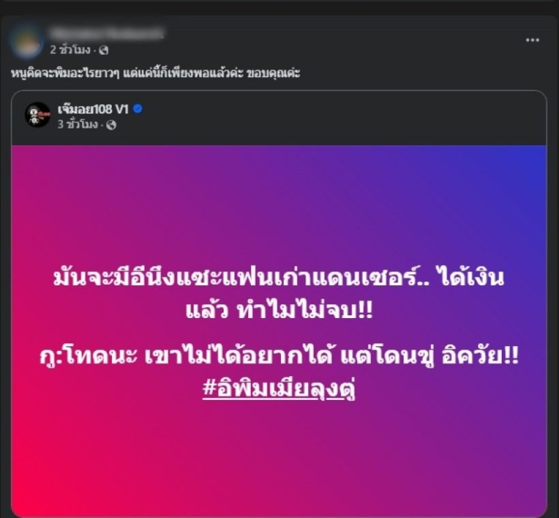 ด้านเพจดัง "เจ๊มอย108 V1" ก็ออกมาแสดงความคิดเห็นว่า "มันจะมีอีนึงแซะแฟนเก่าแดนเซอร์.. ได้เงินแล้ว ทำไมไม่จบ!! กู:โทดนะ เขาไม่ได้อยากได้ แต่โดนขู่ อิควัย!! #อิพิมเมียลุงตู่" ซึ่งอดีตแฟนสาวของบอสก็แชร์โพสต์นี้ต่อ พร้อมแคปชันสั้นๆ ว่า "หนูคิดจะพิมอะไรยาวๆ แต่แค่นี้ก็เพียงพอแล้วค่ะ ขอบคุณค่ะ"
