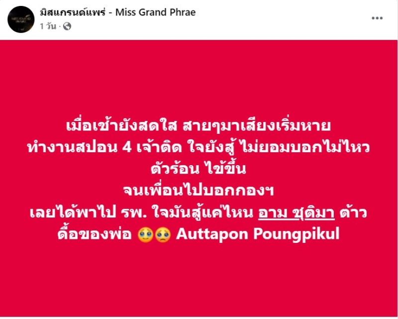 ล่าสุด ทำเอาแฟนๆใจหายเพียบ ทางเพจ มิสแกรนด์แพร่ - Miss Grand Phrae ได้ออกมาโพสต์ว่า เมื่อเช้ายังสดใส สายๆมาเสียงเริ่มหาย ทำงานสปอน 4 เจ้าติด ใจยังสู้ ไม่ยอมบอกไม่ไหว ตัวร้อน ไข้ขึ้น จนเพื่อนไปบอกกองฯ เลยได้พาไป รพ. ใจมันสู้แค่ไหน อาม ชุติมา ต้าวดื้อของพ่อ Auttapon Poungpikul