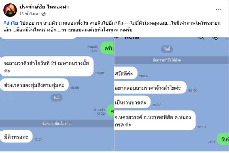 ทั้งนี้ทางด้าน นายห้างประจักษ์ชัย ไหทองคำ ได้เผยแชทเจ้าภาพทักมาจองคิวงานผ่านทางเฟซบุ๊คส่วนตัว ประจักษ์ชัย ไหทองคำ ทั้งงานใหญ่ งานจ้างไปงานบวช พร้อมระบุแคปชั่นขอบคุณทุกๆคน ระบุว่า"#ลำไย ไปต่อยาวๆ ถามคิว มาตลอดทั้งวัน vายคิวไปอีก7คิว-ไม่มีคิวใดหลุดเลย ไม่มีเจ้าภาพใดโทรมายกเลิก มีแต่มีวันไหนว่างอีก.กราบขอบคุณด้วยหัวใจทุกท่านครับ