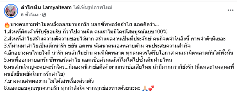 จากกรณีประเด็นดราม่าร้อนแรงสำหรับเรื่องราวความรักของนักร้องสาว ลำไย ไหทองคำ กับ ปุ้ย L.กฮ. และแดนเซอร์ในวง อย่าง บอส ที่ทางด้าน บอส ได้ออกมาเปิดใจเล่าเรื่องราวว่า เจ้าตัวได้โกหก ลำไย ว่าโสด ทั้งที่ยังไม่ได้เลิกกับแฟนสาวของตัวเอง ล่าสุดทางด้านเพจเฟซบุ๊ค ลำไยทีม Lamyaiteam ได้ออกมาโพสต์ถึงสาเหตุที่บางคนยังรักและซัพพอร์ตลำไย