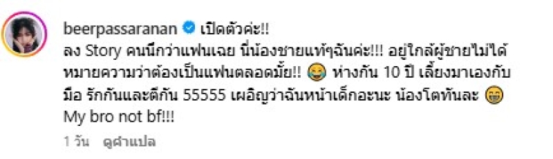 แต่ที่น่าสนใจเป็นพิเศษ คือ ภาพของสาวเบียร์ที่ยืนประกบถ่ายคู่กับหนุ่มน้อย จนทำหลายคนตกจไปชั่วขณะว่าหรือสาวเบียร์จะเปิดตัวรักใหม่หรือไม่ แต่ทว่าในโพสต์ดังกล่าว เจ้าตัวได้มาพร้อมแคปชั่นที่ระบุ เอาไว้ดังนี้ว่า เปิดตัวค่ะ ลงสตอรี่ คนนึกว่าแฟนเฉย นี่น้องชายแท้ๆฉันค่ะ อยู่ใกล้ผู้ชายไม่ได้หมายความว่าต้องเป็นแฟนตลอดไหม ห่างกัน 10 ปี เลี้ยงมาเองกับมือ รักและตีกัน 5555 เผอิญว่าฉันหน้าเด็กอ่ะ น้องโตทันแล้ว ก่อนกล่าวปิดท้ายว่า My bro not bf