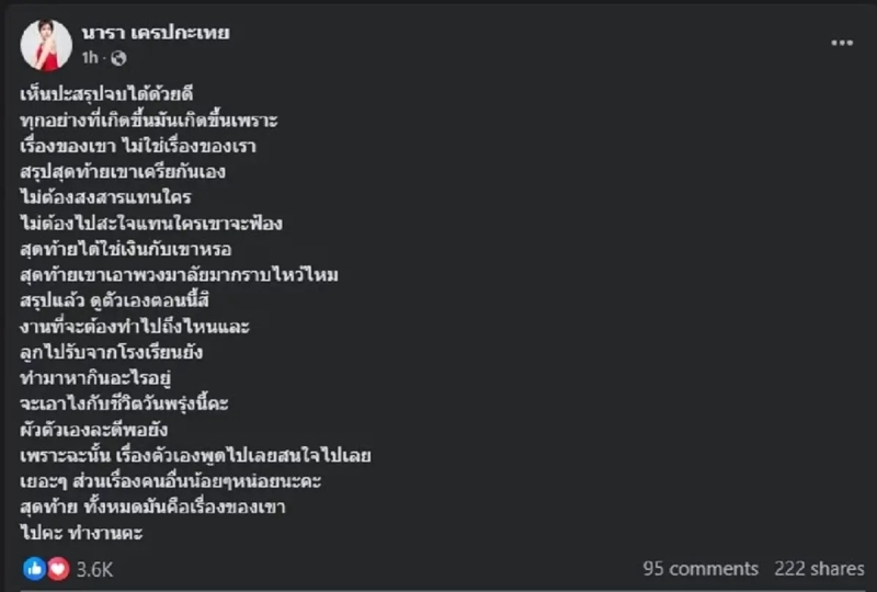ด้าน นารา เครปกะเทย ก็ได้โพสต์ข้อความผ่านเฟซบุ๊ก แสดงความเห็นเกี่ยวกับเรื่องนี้ว่า