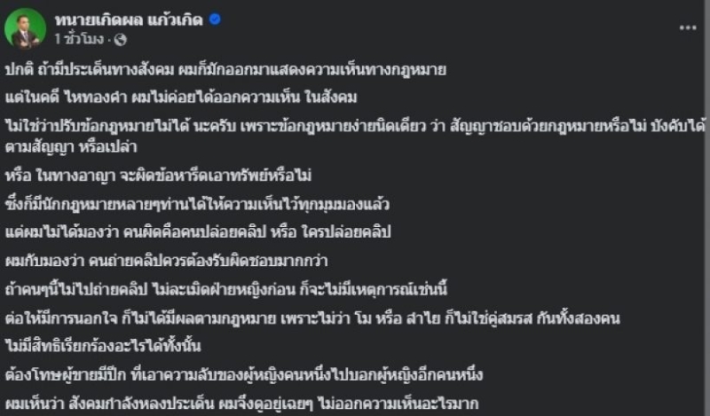 แต่ผมไม่ได้มองว่า คนผิดคือคนปล่อยคลิป หรือ ใครปล่อยคลิป ผมกับมองว่า คนถ่ายคลิปควรต้องรับผิดชอบมากกว่า ถ้าคนๆนี้ไม่ไปถ่ายคลิป ไม่ละเมิดฝ่ายหญิงก่อน ก็จะไม่มีเหตุการณ์เช่นนี้
