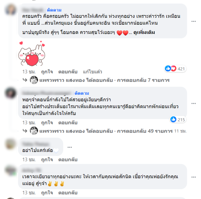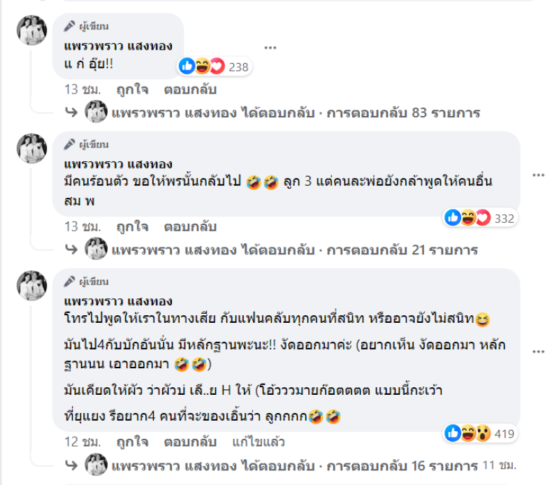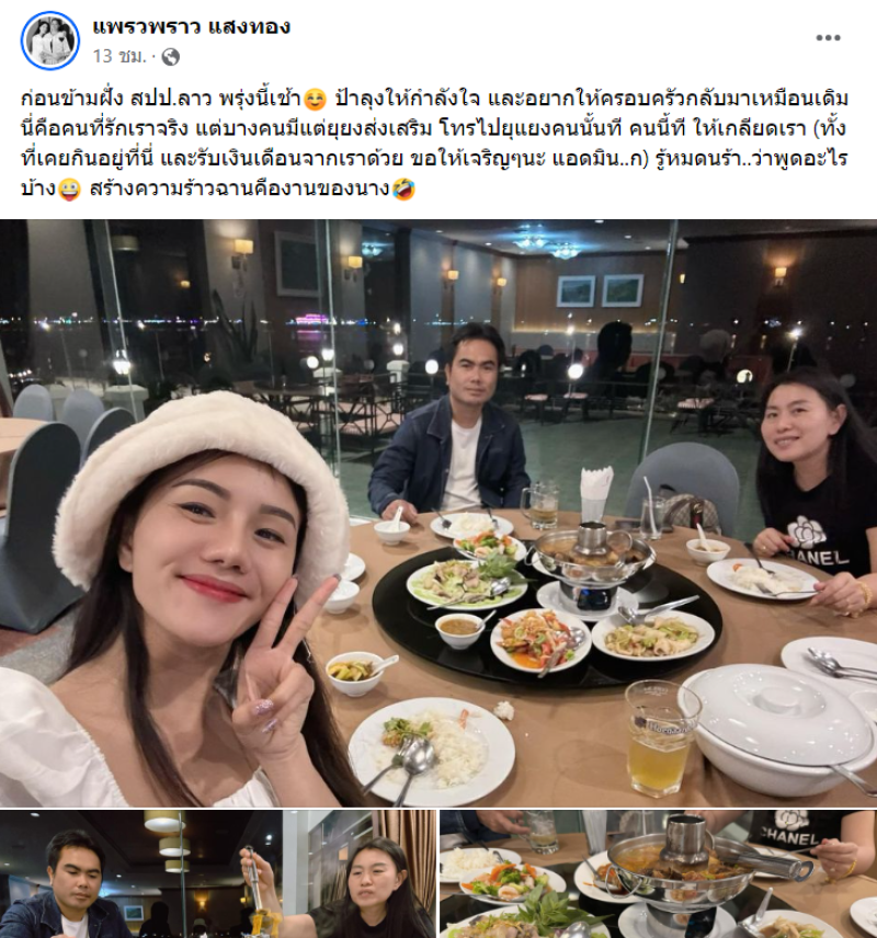 เรียกได้ว่า มีประเด็นเข้ามาเรื่อยๆเลย สำหรับ แพรวพราว แสงทอง ที่ตอนนี้โสดร้อยเต็ม เหลือแค่หน้าที่พ่อและแม่ กับผู้ใหญ่บ้านฟินแลนด์ ล่าสุดแพรวพราว ได้โพสต์อีกครั้งผ่านทางfacebook พร้อมระบุข้อความว่า ก่อนข้ามฝั่ง สปป.ลาว พรุ่งนี้เช้า ป้าลุงให้กำลังใจ และอยากให้ครอบครัวกลับมาเหมือนเดิม นี่คือคนที่รักเราจริง แต่บางคนมีแต่ยุยงส่งเสริม โทรไปยุแยงคนนั้นที คนนี้ที ให้เกลียดเรา (ทั้งที่เคยกินอยู่ที่นี่ และรับเงินเดือนจากเราด้วย ขอให้เจริญๆนะ แอดมิน..ก) รู้หมดนร้า..ว่าพูดอะไรบ้าง สร้างความร้าวฉานคืองานของนาง
