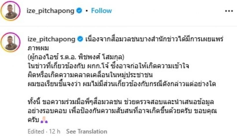 ล่าสุด ผู้กองไอซ์ ได้ออกมาชี้แจงผ่านอินสตาแกรม @ize_pitchapong โดยระบุว่า สื่อบางสำนักได้นำภาพของเขาไปเผยแพร่ในข่าวเกี่ยวกับ ผกก.โจ้ ซึ่งอาจทำให้ประชาชนเกิดความเข้าใจผิด จึงขอยืนยันว่า ไม่มีส่วนเกี่ยวข้องกับกรณีดังกล่าวแต่อย่างใด