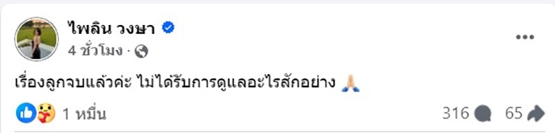 ล่าสุด แบม ไพลิน อัปเดตเพิ่มเติมเกี่ยวกับเรื่องลูก โดยระบุว่า "ขอให้วันนี้เรื่องลูกจบสักทีนะ" และในช่วงเย็นวันเดียวกัน เธอยืนยันว่า "เรื่องลูกจบแล้วค่ะ ไม่ได้รับการดูแลอะไรสักอย่าง"