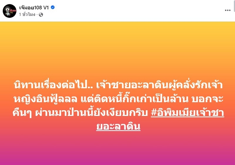 โดยเพจ เจ๊มอย 108 V1 ระบุว่า "นิทานเรื่องต่อไป.. เจ้าชายอะลาดินผู้คลั่งรักเจ้าหญิงอินฟู้ลลล แต่ติดหนี้กิ๊กเก่าเป็นล้าน บอกจะคืน ๆ ผ่านมาป่านนี้ยังเงียบกริบ #อิพิมเมียเจ้าชายอะลาดิน"