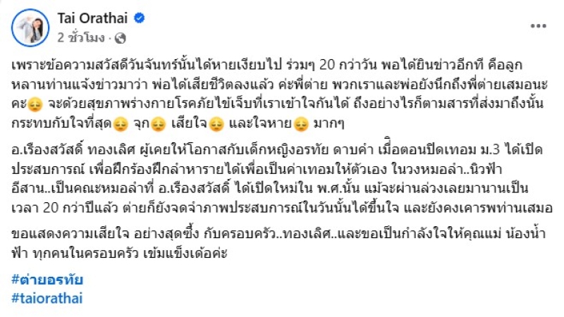 เรียกได้ว่า เป็นนักร้องลูกทุ่งสาว อย่าง ต่าย อรทัย ที่ล่าสุดได้ออกมาโพสต์ข่าวเศร้าผ่านfacebook ส่วนตัว โดยได้เผยว่า เพราะข้อความสวัสดีวันจันทร์นั้นได้หายเงียบไป ร่วมๆ 20 กว่าวัน พอได้ยินข่าวอีกที คือลูกหลานท่านแจ้งข่าวมาว่า พ่อได้เสียชีวิตลงแล้ว ค่ะพี่ต่าย พวกเราและพ่อยังนึกถึงพี่ต่ายเสมอนะคะ จะด้วยสุขภาพร่างกายโรคภัยไข้เจ็บที่เราเข้าใจกันได้ ถึงอย่างไรก็ตามสารที่ส่งมาถึงนั้น กระทบกับใจที่สุด จุก เสียใจ และใจหาย มากๆ