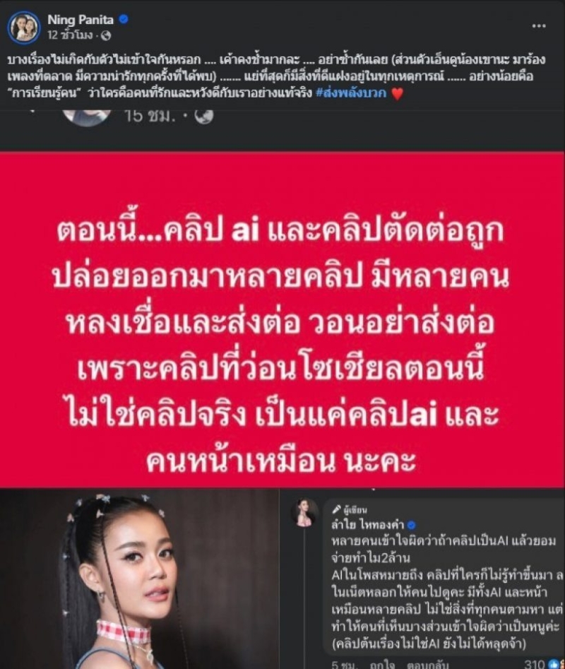 นอกจากนี้ แฟนคลับและชาวเน็ตจำนวนมากยังเข้ามาแสดงความคิดเห็นใต้โพสต์ของหนิง ปณิตา โดยส่วนใหญ่ชื่นชมทัศนคติที่เป็นกลางและให้กำลังใจ พร้อมทั้งแสดงความเห็นว่า ทุกคนล้วนเคยเจอช่วงเวลาที่ยากลำบาก และสิ่งสำคัญคือการเรียนรู้และเติบโตจากเหตุการณ์เหล่านั้น หลายคนยังร่วมส่งกำลังใจให้ลำไยให้ผ่านพ้นเรื่องนี้ไปได้อย่างเข้มแข็งอีกด้วย.