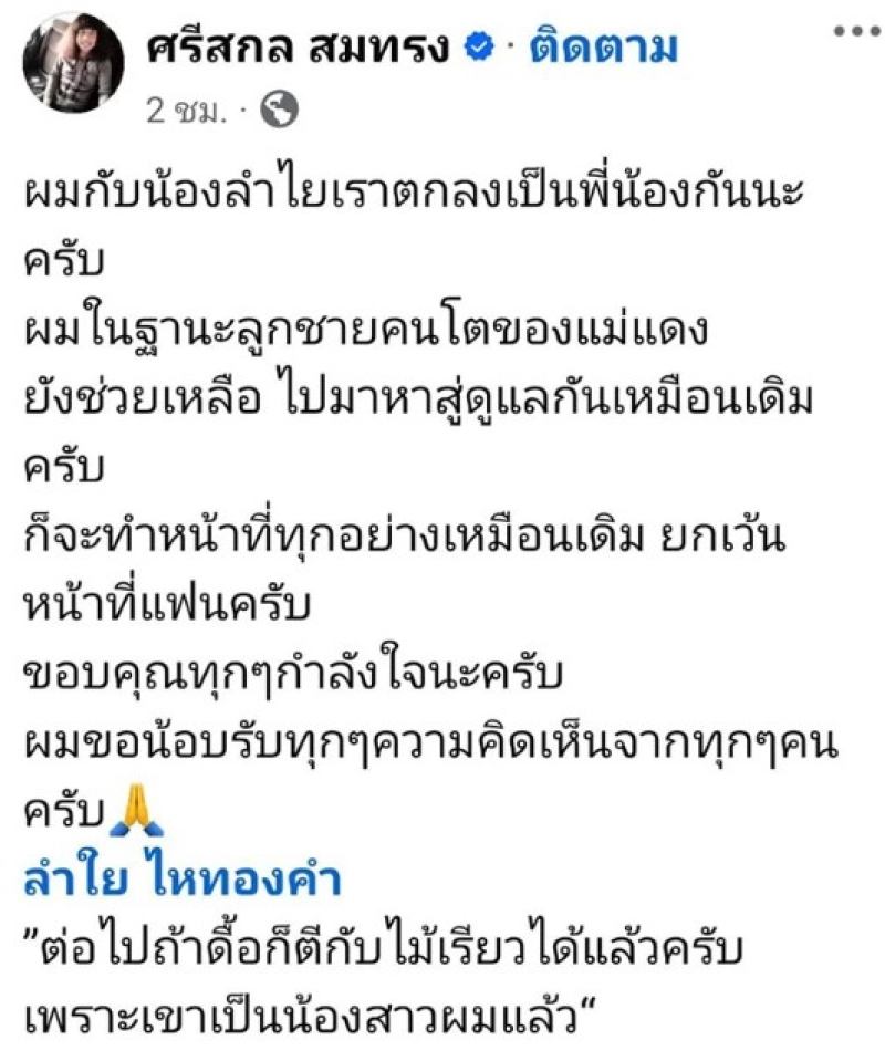 ล่าสุด ด้านหนุ่มปุ้ย ได้ออกมาเคลื่อนไหวผ่านโซเชียลอีกครั้ง พร้อมเอ่ยถึงสถานะของทั้งคู่ในตอนนี้ว่า ผมกับน้องลำไย เราตกลงเป็นพี่น้องกันนะครับ ผมในฐานะลูกชายคนโตของแม่แดง ยังช่วยเหลือ ไปมาหาสู่ดูแลกันเหมือนเดิมครับ ยังทำหน้าทุกอย่างเหมือนเดิม ยกเว้นหน้าที่แฟนครับ พร้อมกล่าวปิดท้ายว่า ขอบคุณทุกกำลังใจนะครับ ผมขอน้อมรับทุกๆความคิดเห็นจากทุกๆคนครับ ทั้งนี้ยังแท็กด้านสาวลำไยอีกว่า ต่อไปถ้าดื้อก็ตีกับไม้เรียวได้แล้วครับ เพราะเขาเป็นน้องสาวผมแล้ว