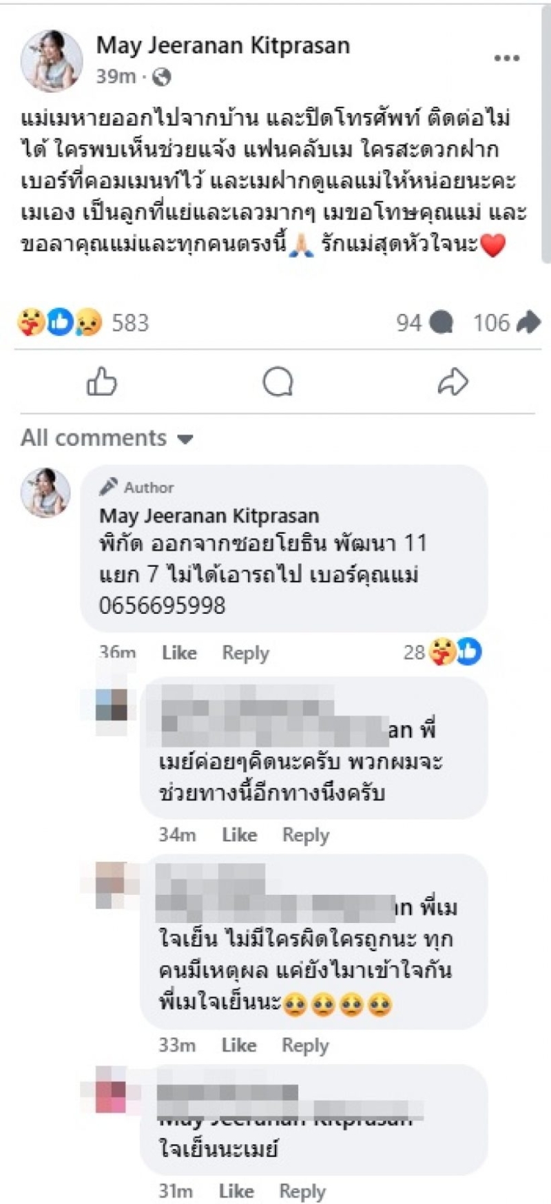 โดยเจ้าตัวระบุว่า “แม่เมหายออกจากบ้าน และปิดโทรศัพท์ ติดต่อไม่ได้ ใครพบเห็นช่วยแจ้ง แฟนคลับเม ใครสะดวกฝากเบอร์ที่คอมเมนต์ไว้ และเมฝากดูแลแม่ให้หน่อยนะคะ เมเองเป็นลูกที่แย่และเลวมากๆ เมขอโทษคุณแม่ และขอลาคุณแม่ และทุกคนตรงนี้ รักแม่สุดหัวใจ” พร้อมเผยพิกัดสุดท้ายที่ทราบคือ ซอยโยธินพัฒนา 11 แยก 7 และยืนยันว่าแม่ไม่ได้เอารถไป
