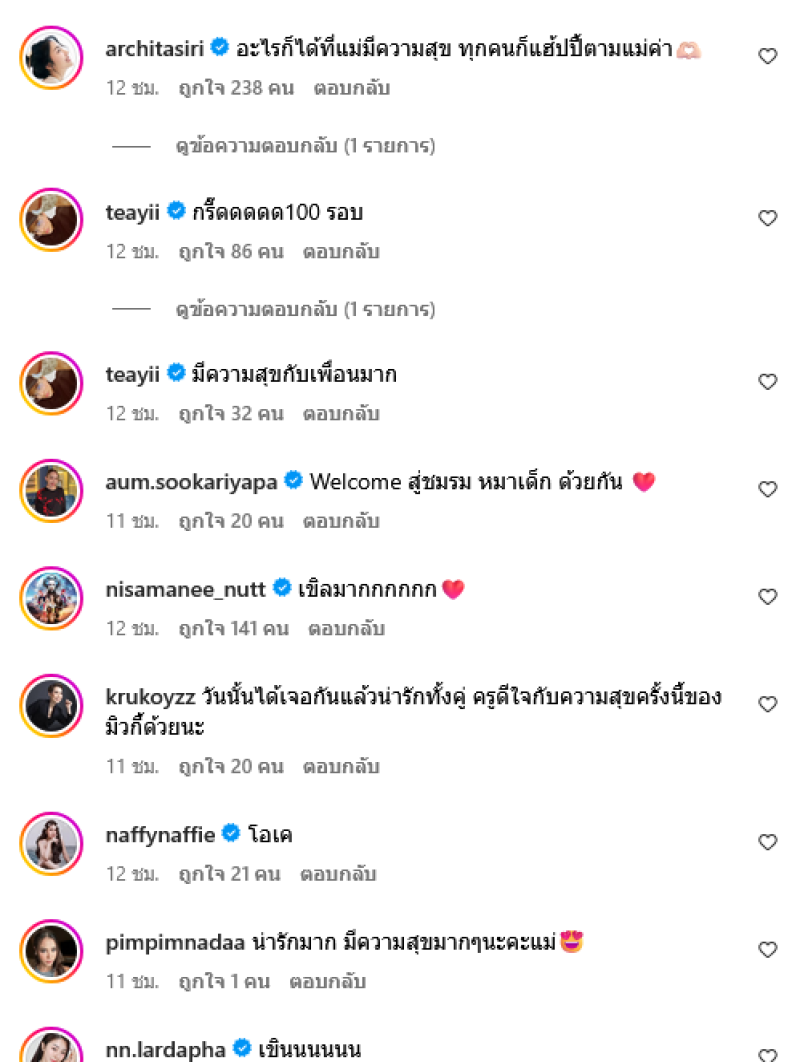 ท่ามกลางเพื่อนๆในวงการเเละเเฟนๆต่างเข้ามาคอมเมนต์แสดงความยินดีกันอย่างมาก อาทิ อะไรก็ได้ที่แม่มีความสุข ทุกคนก็แฮ้ปปี้ตามแม่ค่า,กรี๊ด100 รอบ,มีความสุขกับเพื่อนมาก,น่ารักมาก มีความสุขมากๆนะคะแม่ เป็นต้น