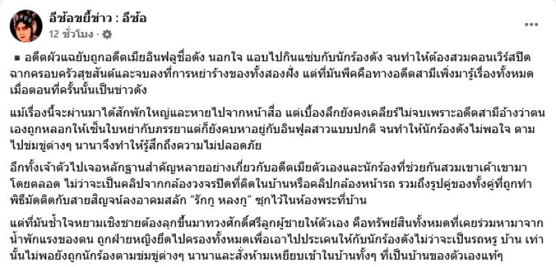 เรียกได้ว่ามีประเด็นมาให้ชาวเน็ตได้ใส่ใจกันอีกแล้วเมื่อทางด้านเพจ อีซ้อขยี้ข่าว : อีซ้อ ได้ออกมาโพสต์ข้อความว่า อดีตผัวแฉยับถูกอดีตเมียอินฟลูชื่อดัง นอกใจ แอบไปกินแซ่บกับนักร้องดัง จนทำให้ต้องสวมคอนเวิร์สปิดฉากครอบครัวสุขสันต์และจบลงที่การหย่าร้างของทั้งสองฝั่ง แต่ที่มันพีคคือทางอดีตสามีเพิ่งมารู้เรื่องทั้งหมดเมื่อตอนที่ครั้งนั้นเป็นข่าวดัง