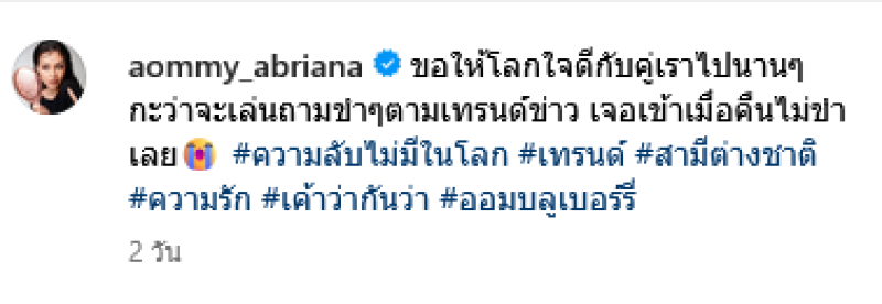 เรียกได้ว่าเป็นอีกหนึ่งนักร้องสาวเสียงดีสำหรับ ออม บลูเบอร์รี่ ที่ล่าสุดได้ออกมาเล่าเรื่องราวสะเทือนใจหลังรู้ความลับของสามีที่ไม่เคยรู้มาก่อน โดย ออม เล่าผ่านทางอินสตาแกรมส่วนตัว aommy_abriana พร้อมเขียนแคปชั่นว่า ขอให้โลกใจดีกับคู่เราไปนานๆ กะว่าจะเล่นถามขำๆตามเทรนด์ข่าว เจอเข้าเมื่อคืนไม่ขำเลย