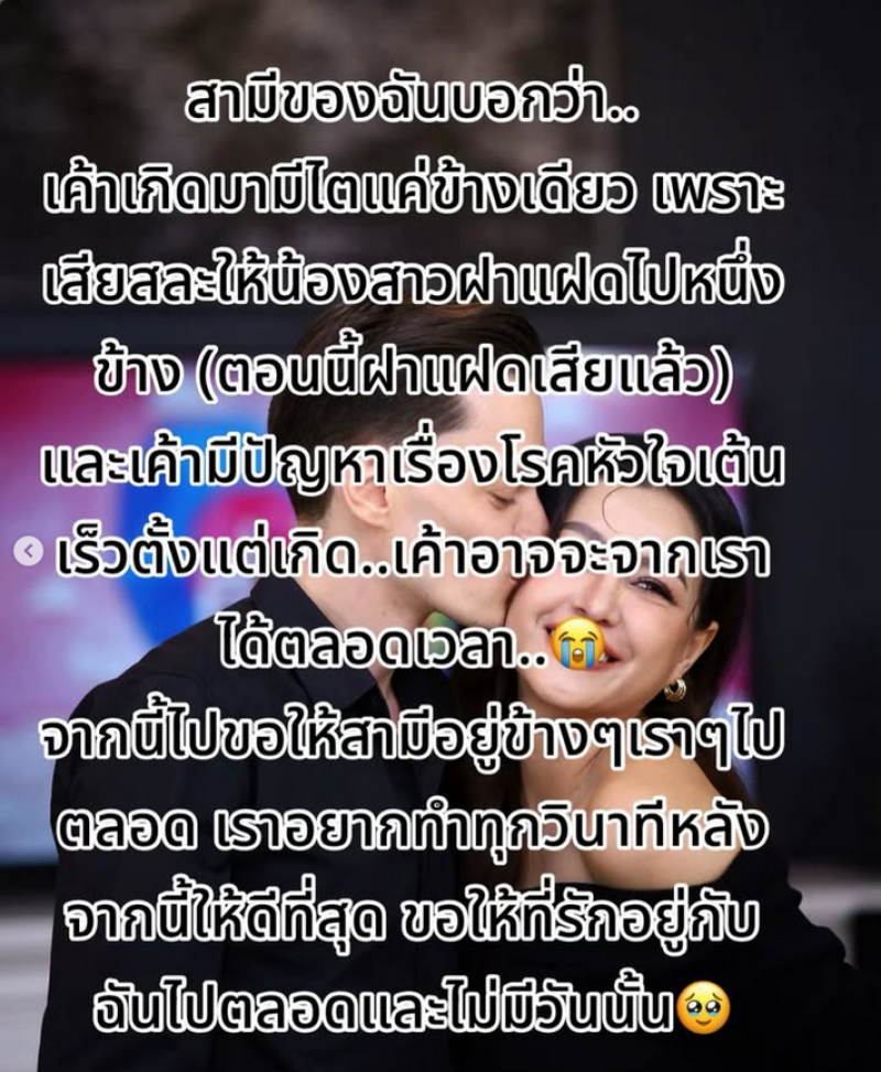 ทั้งนี้ยังเล่าความลับว่า เมื่อทุกๆคนมีความลับ.. แต่ฉันได้รู้ความลับจากสามี จนเกือบทรุด ความลับนั้นคือ สามีของฉันบอกว่า.. เค้าเกิดมามิไตแค่ข้างเดียว เพราะ เสียสละให้น้องสาวฝาแฝดไปหนึ่งข้าง (ตอนนี้ฝาแฝดเสียแล้ว) และเค้ามีปัญหาเรื่องโรคหัวใจเต้น เร็วตั้งแต่เกิด..เค้าอาจจะจากเราได้ตลอดเวลา จากนี้ไปขอให้สามีอยู่ข้างๆเราๆไป ตลอด เราอยากทำทุกวินาทีหลังจากนี้ให้ดีที่สุด ขอให้ที่รักอยู่กับฉันไปตลอดและไม่มีวันนั้น