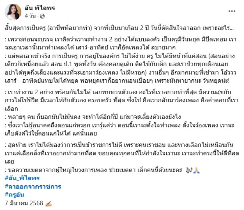 โดยล่าสุด อัน พิไลพร ได้โพสต์ข้อความระบุว่า สิ้นสุดการเป็นครู (อาชีพที่อยากทำ) จากที่เป็นมาเกือบ 2 ปี วันนี้ตัดสินใจลาออก เพราะอะไร เพราะก่อนจะบรรจุ เราคิดว่าเราจะทำงาน 2 อย่างได้แบบลงตัว เป็นครูมีวันหยุด มีปิดเทอม เราจะเอาเวลานั้นมาทำเพลงได้ เสาร์-อาทิตย์ เราก็อัดเพลงได้ สบายมาก