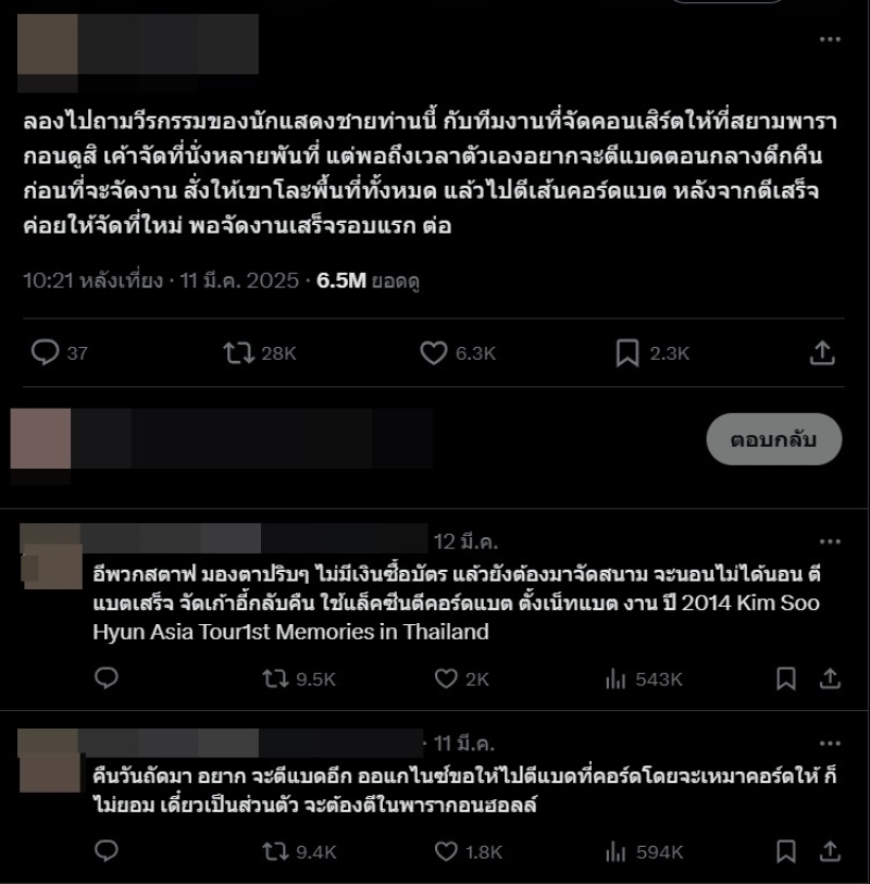 ล่าสุด มีผู้ใช้บัญชีใน x รายนึง ได้ออกมาแฉพฤติกรรมของนักแสดงชายตัวท็อปแดนกิมจิ อย่าง คิมซูฮยอน ในทำนองว่า สมัยจัดงานแฟนมีตติ้ง ที่สยามพารากอน เมื่อปี 2014 ทางทีมงานได้จัดที่นั่งหลายพันที่ แต่ด้านคิมซูฮยอน อยากตีแบตตอนกลางดึกขึ้นมา เลยให้ทีมงานโละพื้นที่ทั้งหมด พร้อมให้ตีเส้นคอร์ดแบด ซึ่งทางออแกไนซ์ได้ขอให้เจ้าตัวไปตีแบดที่คอร์ด โดยจะเหมาคอร์ดให้ แต่เจ้าตัวไม่ยอม ซึ่งการกระทำนี้ได้สร้างความเดือดร้อนให้กับเหล่าทีมงาน จนแทบไม่ได้หลับนอน จนทำให้ประเด็นข่าวนี้ยิ่งทวีความร้อนเพิ่มขึ้นกันเลยทีเดียว