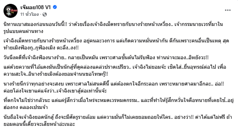 เรียกได้ว่าเรื่องมีทานมาเล่าให้ชาวเน็ตฟังกันอยู่เรื่อยเลยทีเดียวสำหรับเพจ เจ๊มอย 108 V1 ที่ล่าสุดได้ออกมาเล่านิทานเบาๆก่อนนอน ระบุว่า นิทานเบาสมองก่อนนอนวันนี้!! ว่าด้วยเรื่องเจ้าฉิงเม็ดทรายกับนางร้ายหน้าเหวี่ยง.. เจ้ากรรมนายเวรที่มาในรูปแบบคนผ่านทาง