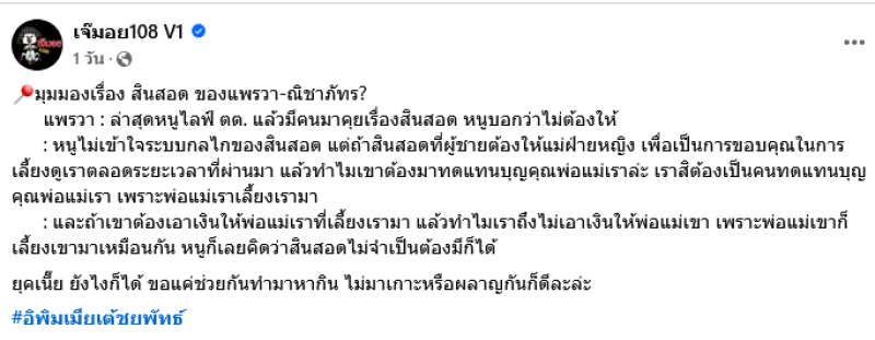เรียกได้ว่าเป็นอีกหนึ่งนางเอกสาวมากฝีมือสำหรับ แพรวา ณิชาภัทร ฉัตรชัยพลรัตน์ ที่ได้คบหากับแฟนหนุ่ม เต้ ชยพัทธ์ มานานกว่า 1 ปี ล่าสุดเป็นประเด็นที่หลายคนต่างเห็นด้วยเมื่อทางด้านเพจ เจ๊มอย108 V ได้ออกมาเผยมุมมองของ แพรวา เรื่องสินสอด ว่า
