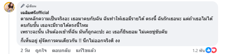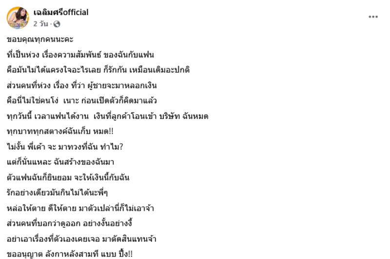 โดยระบุว่า ขอบคุณทุกคนนะคะ ที่เป็นห่วง เรื่องความสัมพันธ์ ของฉันกับแฟน คือ มันไม่ได้แครงใจอะไรเลย ก็รักกัน เหมือนเดิมอะปกติ ส่วนคนที่ห่วง เรื่อง ที่ว่า ผู้ชายจะมาหลอกเงิน คือนี่ไม่ใช่คนโง่ เนาะ ก่อนเปิดตัวก็คิดมาแล้ว ทุกวันนี้ เวลาแฟนได้งาน เงินที่ลูกค้าโอนเข้า บริษัท ฉันหมด ทุกบาททุกสตางค์ฉันเก็บ หมด ไม่งั้น พี่เค้า จะ มาทวงที่ฉัน ทำไม? แต่ก็นั่นแหละ ฉันสร้างของฉันมา ตัวแฟนฉันก็ยินยอม จะให้เงินนี้กับฉัน