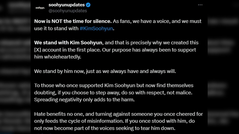 ล่าสุด แอคเคานท์ของแฟนคลับคิมซูฮยอน ที่มีผู้ติดตามบนเอ็กซ์มากกว่า 30,000 คน ได้เอ่ยพึงกรณีดราม่าดังกล่าวนี้ว่า ตนขอย้ำชัด ประกาศจุดยืนอย่างชัดเจนว่าจะขออยู่เคียงข้างคิมซูฮยอนต่อไป สำหรับแฟนคลับคนไหนที่เริ่มลังเลอยากเลิกติดตาม วอนขอให้จากไปด้วยความเคารพกัน ไม่ใช่มุ่งร้ายทำลายคิมซูฮยอน โดยพวกตนจะขอปกป้องคิมซูฮยอนต่อไปในฐานะแฟนคลับที่จะร่วมเดินไปบนเส้นทางนี้กับเขาด้วยความเชื่อและจะสนับสนุน พร้อมยืนเคียงข้างเขาเสมอไป