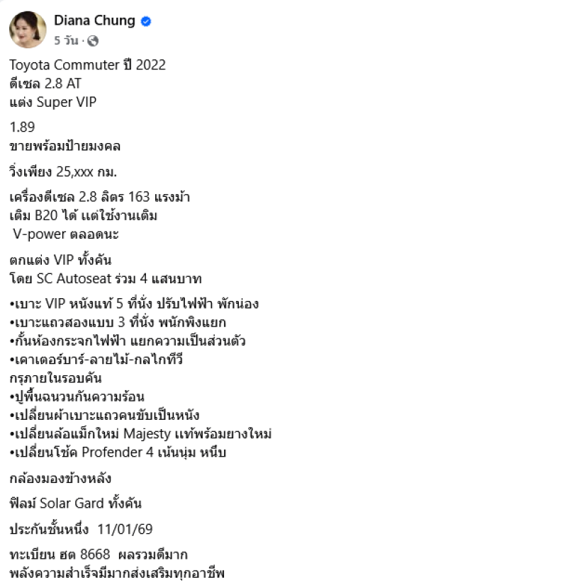 โดยระบุโพสต์ว่า Toyota Commuter ปี 2022 ดีเซล 2.8 AT แต่ง Super VIP 1.89 ขายพร้อมป้ายมงคล วิ่งเพียง 25,xxx กม. เครื่องดีเซล 2.8 ลิตร 163 แรงม้า เติม B20 ได้ เเต่ใช้งานเติมV-power ตลอดนะ