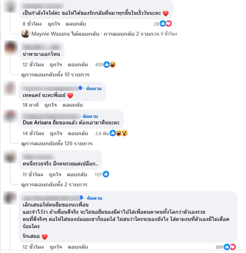 จากกรณีของดาราสาวที่ได้ยืมของไฮโซสาว เมย์ วาสนา หรือ มาดามเมนี่ มูลค่ารวม 62,014,000 ล้านบาท พร้อมทั้งยังตกลงกันเเล้วว่าจะคืนของทั้งหมด เเต่ไม่คืนตามวันเวลาที่ตกลงกันไว้ โดยงานนี้ทางด้าน เมย์ วาสนา ได้ออกมาโพสต์ทรัพย์สินที่ถูกยืมไปผ่านททางเฟซบุ๊ค Maynie Wasana พร้อมเขียนโพสต์ว่า บทเรียนราคาแพงจากการไว้ใจคนผิด ครั้งแรกที่ต้องออกมาโพสต์เรื่องแบบนี้ ไม่เคยคิดว่าจะต้องมีวันนี้