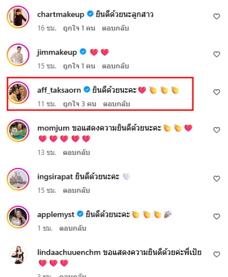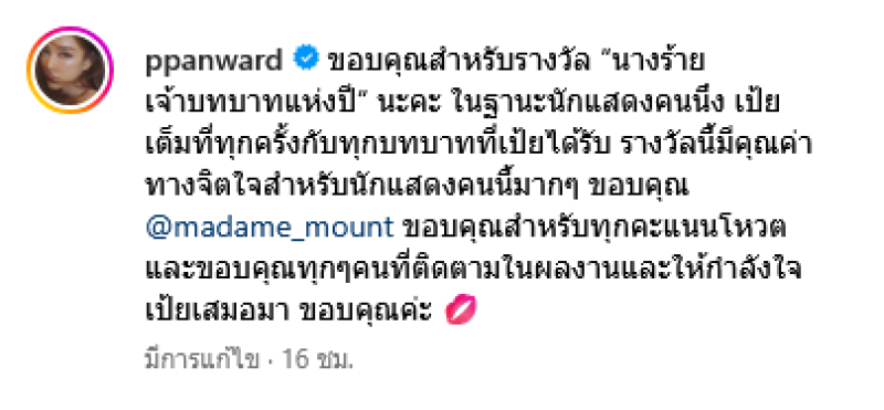รางวัลนี้มีคุณค่าทางจิตใจสำหรับนักแสดงคนนี้มากๆ ขอบคุณ @madame_mount ขอบคุณสำหรับทุกคะแนนโหวต และขอบคุณทุกๆคนที่ติดตามในผลงานและให้กำลังใจเป้ยเสมอมา ขอบคุณค่ะ ท่ามกลางแฟนๆเเละคนในวงการต่างเเสดงความยินดีกันอย่างมาก รวมถึง แอฟ ทักษอร ที่ได้เข้ามาคอมเมนต์ยินดีอีกด้วย