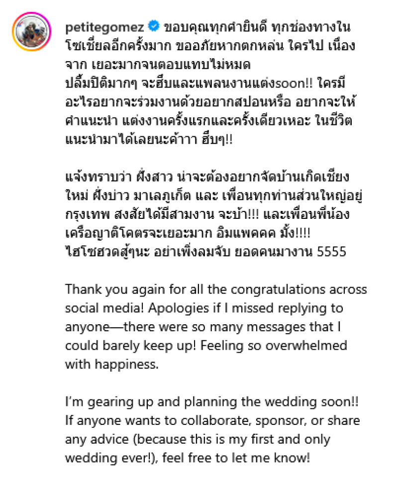 ขอบคุณทุกคำยินดี ทุกช่องทางในโซเชี่ยลอีกครั้งมาก ขออภัยหากตกหล่น ใครไป เนื่องจาก เยอะมากจนตอบแทบไม่หมด ปลื้มปิติมากๆ จะฮึบและแพลนงานแต่งsoon!! ใครมีอะไรอยากจะร่วมงานด้วยอยากสปอนหรือ อยากจะให้คำแนะนำ แต่งงานครั้งแรกและครั้งเดียวเหอะ