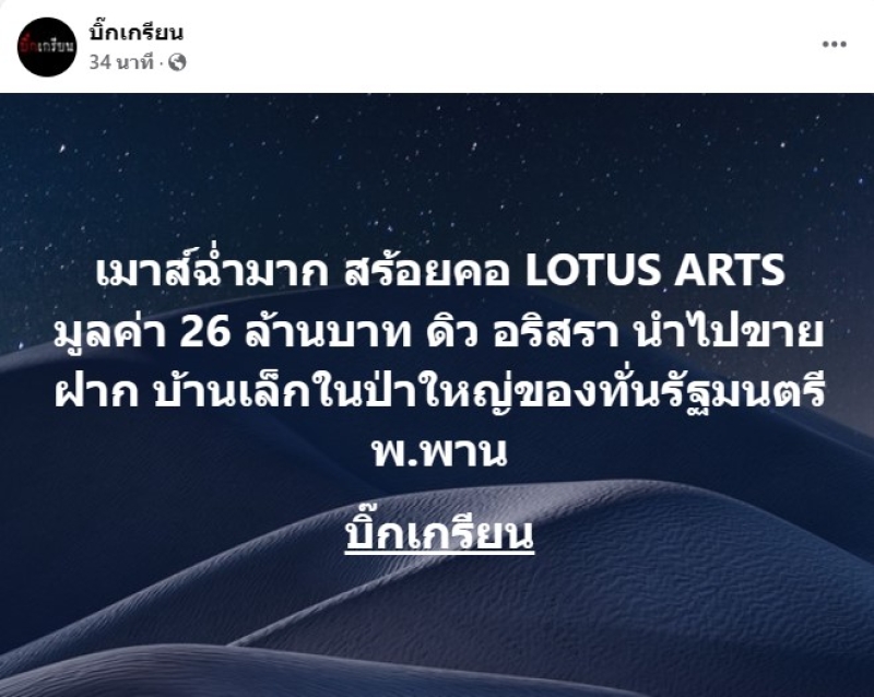 ล่าสุด ทางเพจต่างๆก็ได้ออกมาเปิดว่า สร้อยมูลค่า 26 ล้าน ในกับ นักการเมืองดัง พ นั้นเอง และทางเพจบิ๊กเกรียน ได้เผยว่า เมาส์ฉ่ำมาก สร้อยคอ LOTUS ARTS มูลค่า 26 ล้านบาท ดิว อริสรา นำไปขายฝาก บ้านเล็กในป่าใหญ่ของทั่นรัฐมนตรี พ.พาน