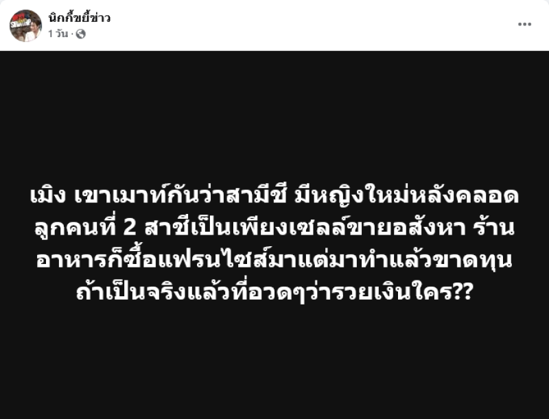 เรียกได้ว่ามีอีกหนึ่งข่าวลือที่เมาท์สนั่นโซเชียลท่ามกลางประเด็นร้อนแรง โดยทางด้านเพจเฟซบุ๊ค นิกกี้ขยี้ข่าว ได้ออกมาเผยข่าวลือว่า เมิง ข่าวเมาท์กันว่าสามีชี มีหญิงใหม่หลังคลอดลูกคนที่ 2! สามีชีเป็นแค่เซลล์ขายอสังหา ร้านอาหารก็ซื้อแฟรนไชส์มา แต่มาทำแล้วขาดทุน ถ้าเป็นจริงแล้วที่อวดๆ ว่ารวย เงินใคร?