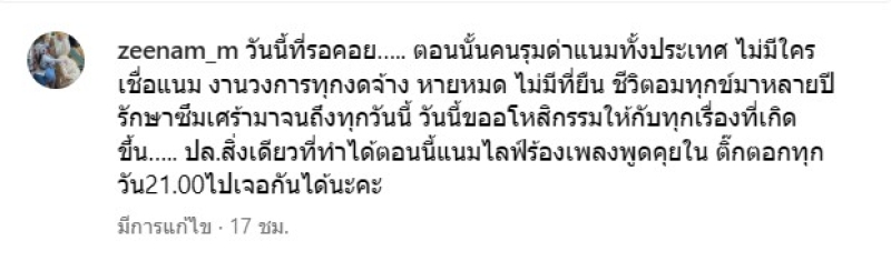 โดยก่อนหน้า ได้ออกมาโพสต์ วันนี้ที่รอคอย….. ตอนนั้นคนรุมด่าแนมทั้งประเทศ ไม่มีใครเชื่อแนม งานวงการทุกงดจ้าง หายหมด ไม่มีที่ยืน ชีวิตอมทุกข์มาหลายปี รักษาซึมเศร้ามาจนถึงทุกวันนี้ วันนี้ขออโหสิกรรมให้กับทุกเรื่องที่เกิดขึ้น….. ปล.สิ่งเดียวที่ทำได้ตอนนี้แนมไลฟ์ร้องเพลงพูดคุยใน ติ๊กตอกทุกวัน21.00ไปเจอกันได้นะคะ