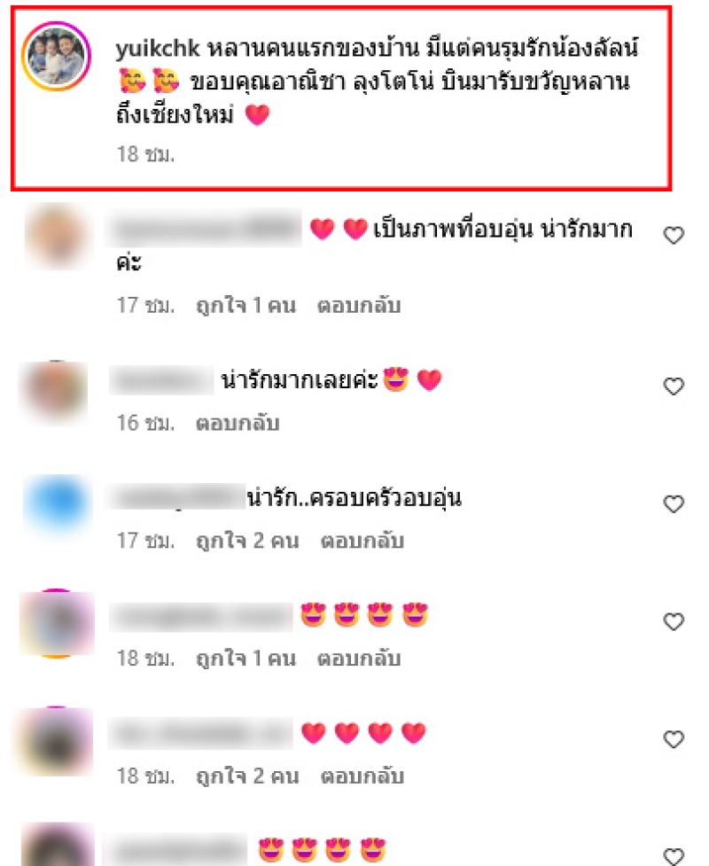พร้อมเขียนแคปชั่นว่า หลานคนแรกของบ้าน มีแต่คนรุมรักน้องลัลน์ ขอบคุณอาณิชา ลุงโตโน่ บินมารับขวัญหลานถึงเชียงใหม่ ท่ามกลางแฟนๆต่างชื่นชมว่าเป็นภาพที่อบอุ่นเเละน่ารักมากๆ