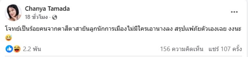 เรียกได้ว่า กำลังเป็นประเด็นในโลกโซเชียลมาก ซึ่งได้มีเหล่าดาราและคนดัง ออกมาพูดเรื่องเวรกรรมมีจริง และเคยเตือนหลายๆคน แต่ล่าสุดทาง นักแสดงสาว ชัญญ่า ทามาดะ โพสต์ข้อความแซ่บสะดุ้ง ผ่านเฟซบุ๊กส่วนตัว Chanya Tamada โดยได้โพสต์ว่า ก็เคยบอกเเล้ว เตือนเเล้ว ไม่มีใครฟังอ่ะ และคอมเมนต์เพิ่มเติมใต้โพสต์ด้วยว่า ไม่เคยเกลียดใครสุ่มสี่สุ่มห้าอยู่เเล้ว เเต่คนนี้คือที่1 ในใจเลย ยอมรับ