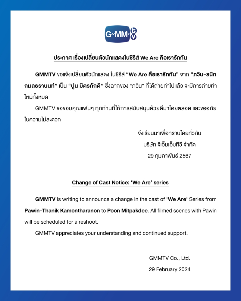 ล่าสุด ทางค่ายออกกมาประกาศอีกครั้ง โดยได้ระบุข้อความว่า ประกาศ เรื่องเปลี่ยนตัวนักแสดงในซีรีส์ We Are คือเรารักกัน Change of Cast Notice: ‘We Are’ series โดยในจดหมายชี้แจงนั้น ได้แจ้งว่า ประกาศ เรื่องเปลี่ยนตัวนักแสดงในซีรีส์ We Are คือเรารักกัน GMMTV จอแจ้งเปลี่ยนตัวนักแสดง ในซีรีส์ “We Are คือเรารักกัน” จาก “กวิน-ธนิก กมลธรานนท์” เป็น “ปูน มิตรภักดี” ซึ่งฉากของ “กวิน” ที่ได้ถ่ายทําไปแล้ว จะมีการถ่ายทํา ใหม่ทั้งหมด