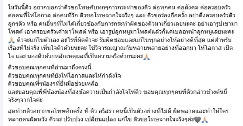 ในวันนี้ดิว อยากบอกว่าดิวขอโทษกับทุกๆการกระทำของดิว ต่อทุกคน ต่อสังคม ต่อครอบครัว ต่อคนที่ให้โอกาส ต่อคนที่รัก ดิวขอโทษจากใจจริงๆ และ ดิวขอร้องอีกครั้ง อย่าดึงครอบครัวดิว ลูกๆดิว หรือ คนอื่นๆที่ไม่ได้เกี่ยวข้องกับการกระทำผิดของดิวมาเกี่ยวเลยนะคะ อย่าเอารูปเขามาโพสต์ เอาครอบครัวเค้ามาโพสต์ หรือ เอารูปลูกหนูมาโพสต์แล้วก็แค่เบลอหน้าลูกหนูเลยนะคะ ดิวจะแก้ไขตัวเอง อะไรที่ผิดดิวจะ รับผิดชอบและแก้ไขทุกอย่างให้อย่างดีที่สุด แต่สำหรับเรื่องที่ไม่จริง เห็นใจดิวด้วยนะคะ ใช้วิจารณญาณกับหลายหลายอย่างที่ออกมา ให้โอกาส เปิดใจ และ มองดิวด้วยหลักเหตุผลที่เป็นความจริงด้วยนะคะ