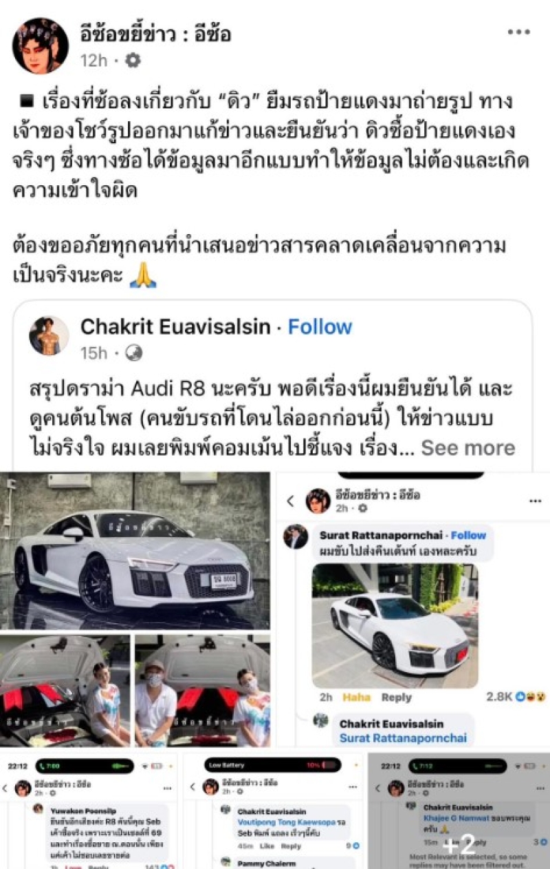 เรียกได้ว่า เป็นดราม่าที่หนักมากๆสำหรับ ดิว อริสรา ที่ก่อนหน้าก็โดนโยงเรื่องรถ จนให้ต้องมีคนออดมาพูดว่าดิวซื้อจริงนั้นเอง ล่าสุดดิวได้แชร์โพสต์ของ อีซ้อขยี้ข่าว: อีซ้อ ที่ได้ขอโทษในส่วนที่นำเสนอข่าวผิดไป โดยดิวได้โพสต์ร่ายยาวบน facebook ว่า ในวันนี้เรื่องจริง ดิว ยอมรับผิดทั้งหมด แต่เรื่องไหนที่ไม่จริง ตรงนี้ดิวต้องขอความเป็นธรรม ให้กับครอบครัวดิว และ ตัวดิวด้วยนะคะ