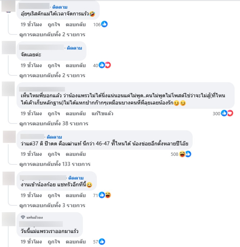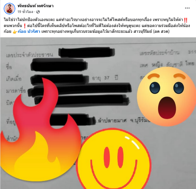 พร้อมระบุว่า ไม่ใช่ว่าไม่ปกป้องตัวเองนะคะ แค่ทำอะไรบางอย่างอาจจะไม่ได้โพสต์หรือบอกทุกเรื่อง เพราะหนูไม่ให้ค่าคนพวกนั้น ต่อไปนี้ใครที่เห็นคลิปหรือโพสต์อะไรที่ไม่ดีไม่ต้องส่งให้หนูดูนะคะ แต่ขอความร่วมมือส่งให้น้องก้อย ก้อย ปวริศา เพราะทุกอย่างหนูเก็บรวบรวมข้อมูลไว้มาสักระยะแล้ว สาวบุรีรัมย์ (ลด สวด)