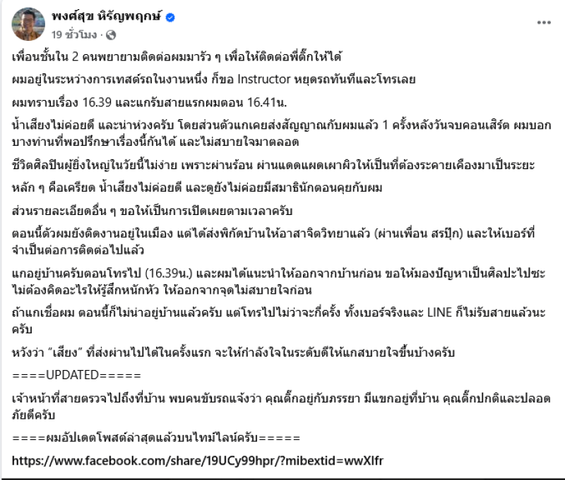 ได้ออกมาเล่าสภาพจิตใจคร่าวๆของ ติ๊ก ชิโร่ ผ่านทางเฟซบุ๊ค พงศ์สุข หิรัญพฤกษ์ ระบุว่า เพื่อนชั้นใน 2 คนพยายามติดต่อผมมารัวๆ เพื่อให้ติดต่อพี่ติ๊กให้ได้ ผมอยู่ในระหว่างการเทสต์รถในงานหนึ่ง ก็ขอ Instructor หยุดรถทันทีและโทรเลย ผมทราบเรื่อง 16.39 และแกรับสายแรกผมตอน 16.41 น.