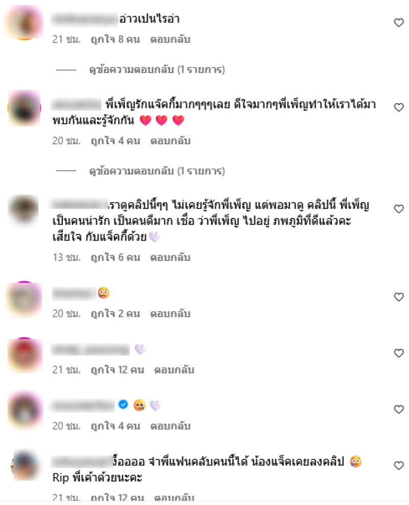 และขอบคุณชุด ทุกอย่างที่เกิดขึ้นจุกอก บอกไม่ถูก แต่ถึงตอนนี้แล้วเราก็คงแก้ไขอะไรไม่ได้นอกจากนึกถึงแต่ความทรงจำดีดีที่เคยมีกันและกันขอให้พี่เพ็ญได้ไปอยู่ในภพภูมิที่ดี รักพี่เพ็ญน๊า ท่ามกลางแฟนๆที่รู้จักพี่เพ็ญต่างเข้ามาคอมเมนต์ใจหายและเสียใจกันอย่างมาก