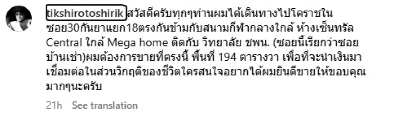 เจ้าตัวก็ยังคงเดินหน้ารับผิดชอบในส่วนนี้ต่อไปอย่างไม่ลดละความพยายาม ล่าสุด ติ๊ก ชีโร่ ได้ออกมาประกาศขายที่ดินผืนงาม 194 ตารางวา จังหวัดโคราช พร้อมเผยถึงเหตุผลว่า ต้องการไปเชื่อมต่อกับส่วนวิกฤติของชีวิต หากใครสนใจอยากได้ ตนพร้อมยินดีขายให้ ขอบคุณมากๆนะครับ