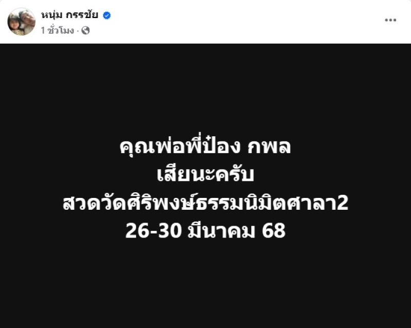 โดย ทาง หนุ่ม กรรชัย ก็ได้ออกมาโพสต์ว่า คุณพ่อพี่ป๋อง กพล เสียนะครับ สวดวัดศิริพงษ์ธรรมนิมิตศาลา2 26-30 มีนาคม 68